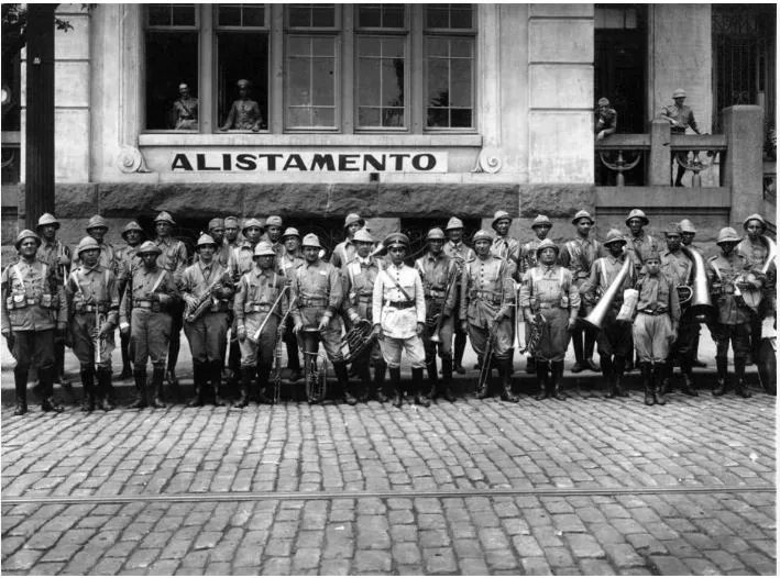 Soldados posam em frente ao quartel de alistamento em São Paulo em 1932. Imagem: acervo o Estado de São Paulo.