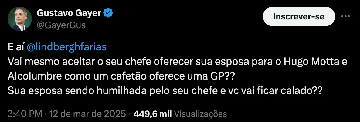 "Vai mesmo aceitar o seu chefe oferecer sua esposa para o Hugo Motta e Alcolumbre como um cafetão oferece uma GP? Sua esposa sendo humilhada pelo seu chefe e você vai ficar calado?"