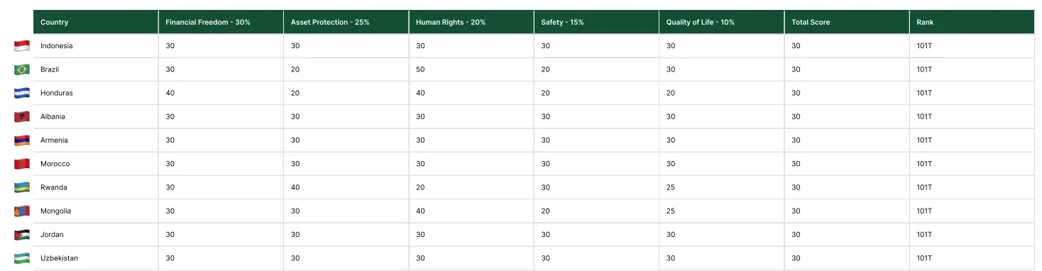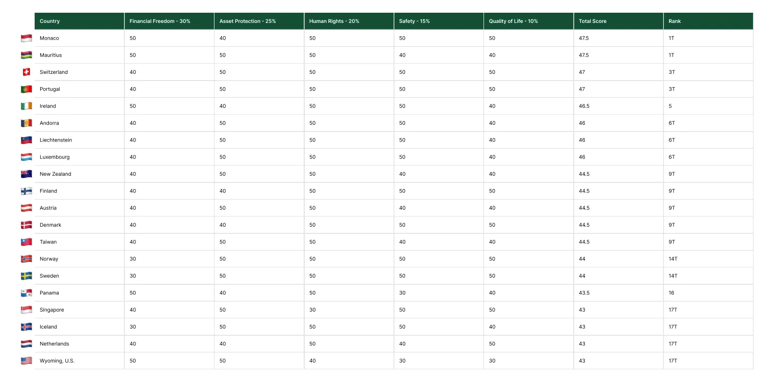 O resultado reflete a combinação dos cinco critérios avaliados: liberdade financeira, proteção de ativos, direitos humanos, segurança e qualidade de vida.