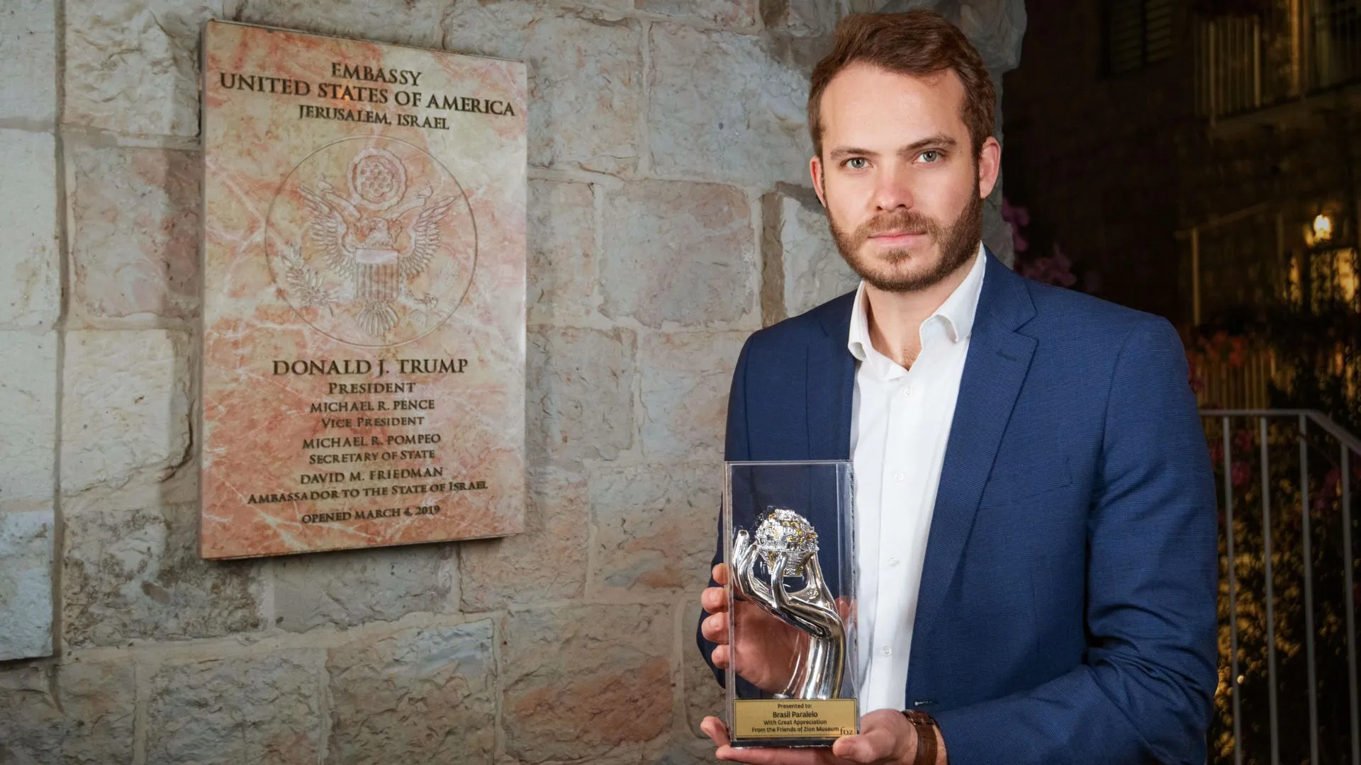 Filipe Valerim, fundador da Brasil Paralelo, posa com o prêmio Friends of Zion recebido em Israel. Foto: Produção Brasil Paralelo.