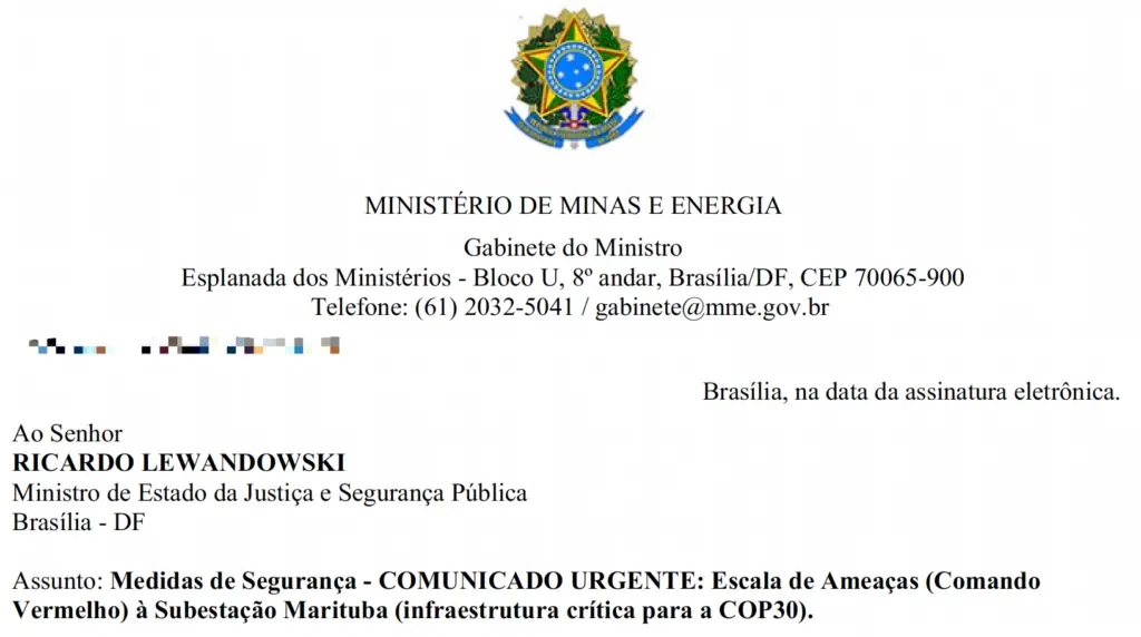 As ameaças foram registradas em um segundo documento classificado como “comunicado urgente” enviado em 31 de outubro pelo ministro de Minas e Energia.