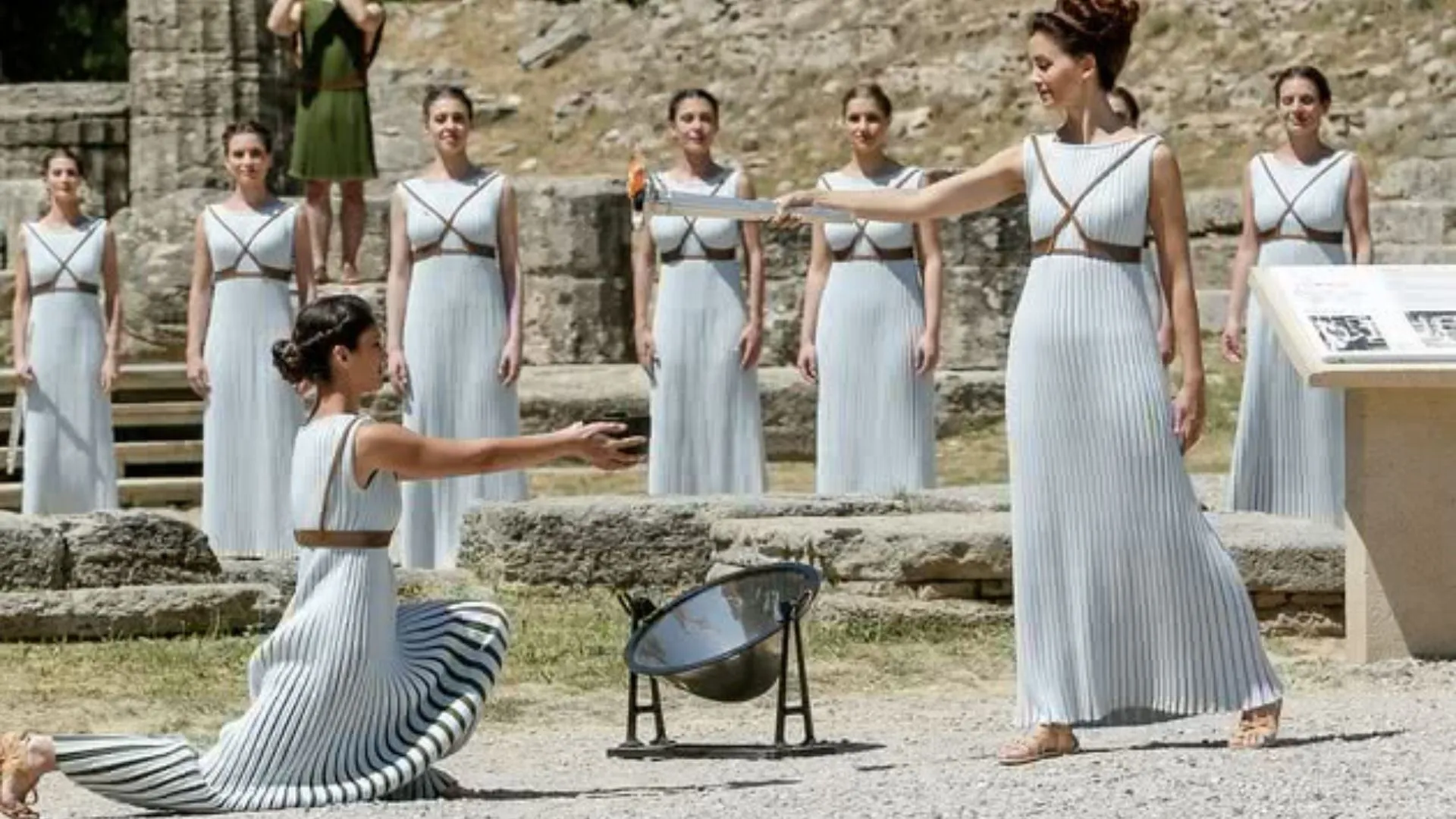 A tocha é acesa por mulheres vestidas como sacerdotisas gregas nas ruínas do Templo de Hera, em Olímpia.
