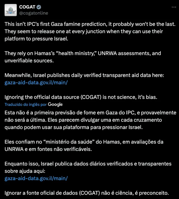 A Coordenação de Atividades Governamentais nos Territórios (Cogat), órgão militar que administra as travessias, criticou o IPC por confiar em entidades ligadas ao Hamas sem considerar os dados apresentados por Jerusalém.