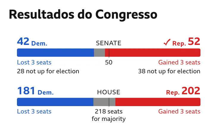 Na Câmara, o desfecho também foi favorável. As últimas projeções indicam que os Republicanos lideram em vários condados. Se as estimativas se confirmarem, serão 202 republicanos contra 181 democratas.