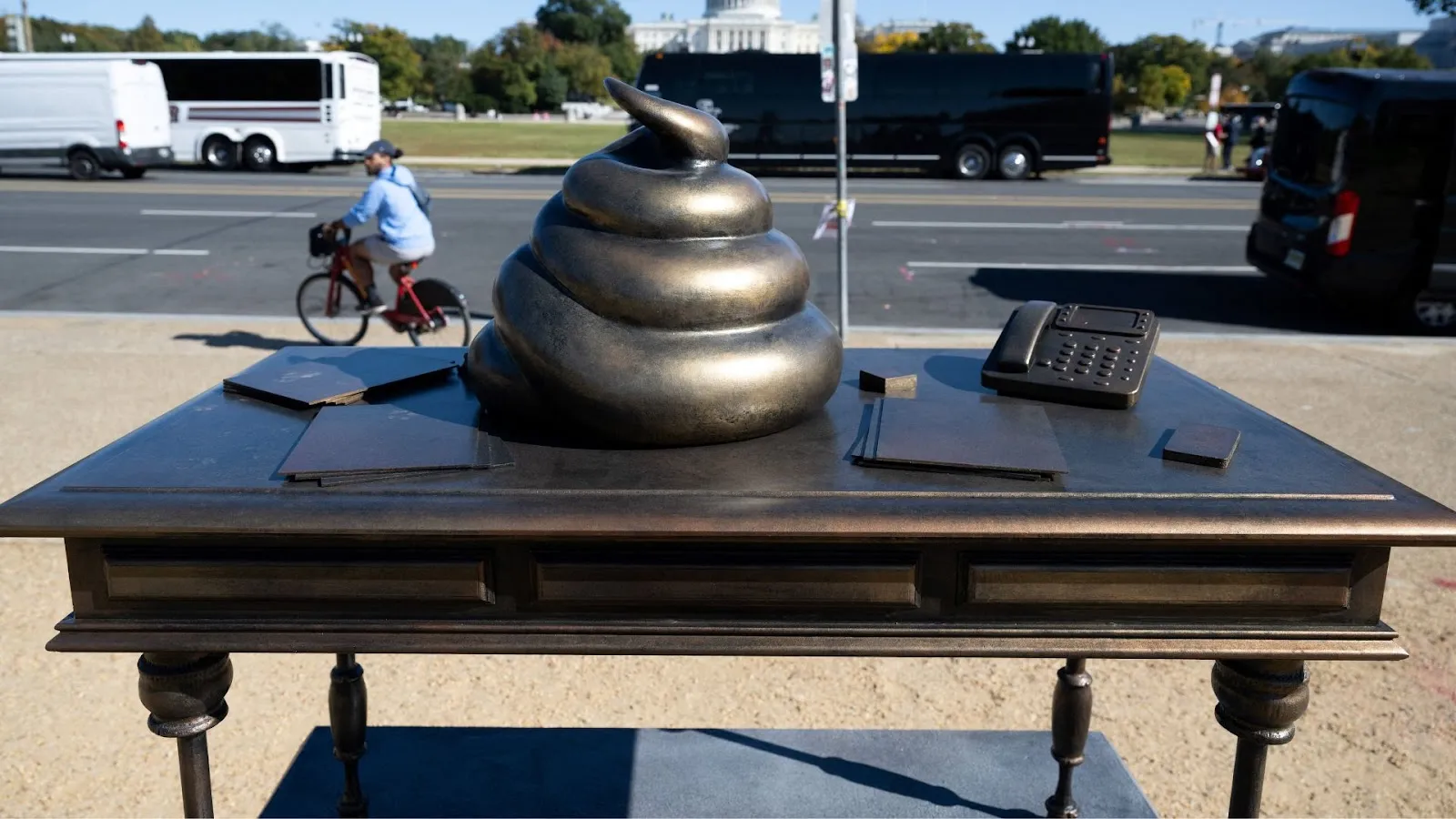 Antes eles fizeram uma réplica da mesa de Nancy Pelosi com uma pilha de fezes, aludindo à invasão ao Capitólio.