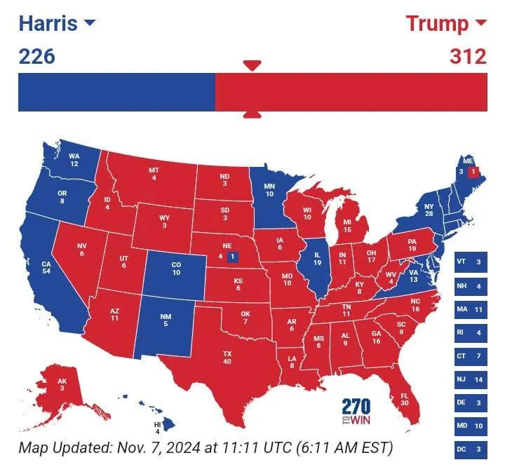 Mapa com o resultado das eleições presidenciais. Fonte: 270 to Win.