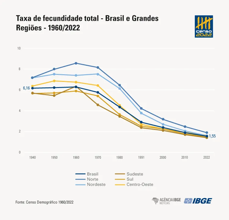 O Brasil vive a menor taxa de fecundidade de sua história: 1,55 filho por mulher, de acordo com o último Censo do IBGE.O índice está abaixo do nível de reposição populacional (2,1), patamar necessário para que a população não entre em declínio.