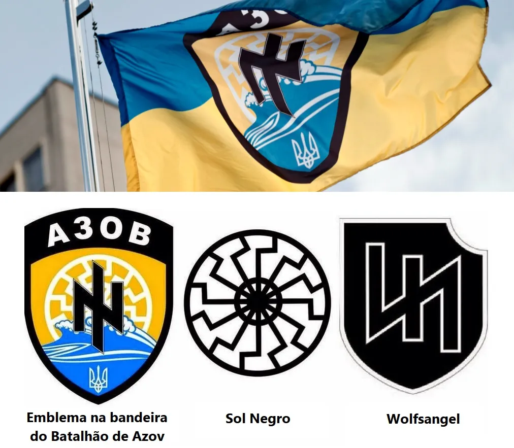 Bandeira e simbolos do batalhão Azov. Imagem: reprodução X.