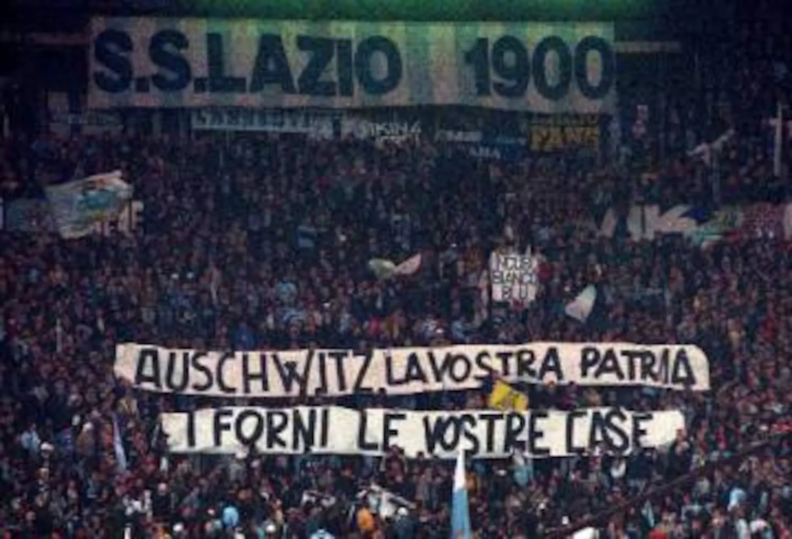 Um cartaz em 1998 em uma partida da Lazio contra a Roma. Imagem: AFP