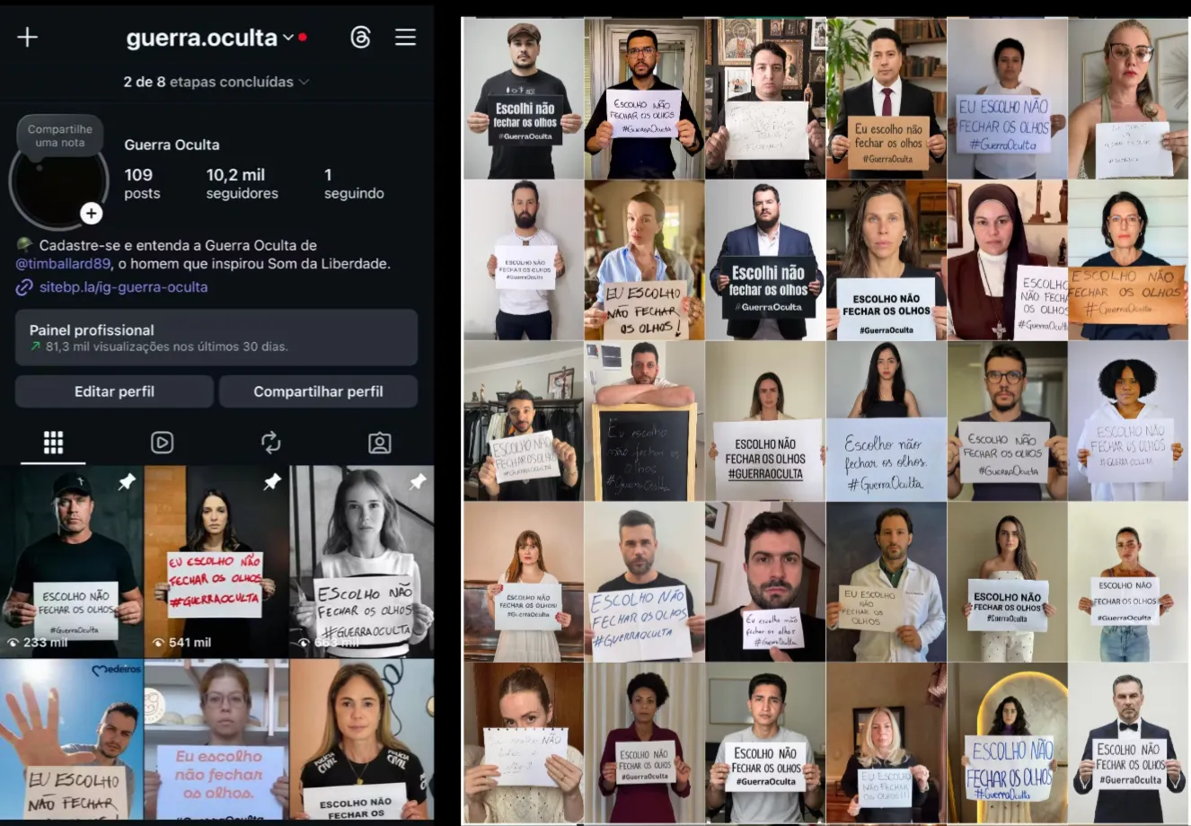 Todas as publicações direcionam para o perfil @guerra.oculta. Quem segue a página e acessa o link disponível pode se cadastrar para o lançamento do documentário produzido por Tim Ballard e acompanhar de perto suas operações de combate ao tráfico infantil.