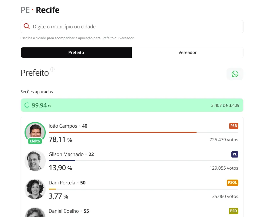 O filho mais velho de Eduardo Campos continuará sendo prefeito de Recife. João Campos (PSB) foi reeleito com mais de 78% dos votos válidos.