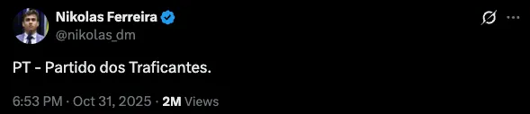 O post foi feito na última sexta-feira (31) e viralizou nas redes sociais. A publicação coincidiu com a repercussão da megaoperação policial realizada nos complexos da Penha e do Alemão, no Rio de Janeiro.