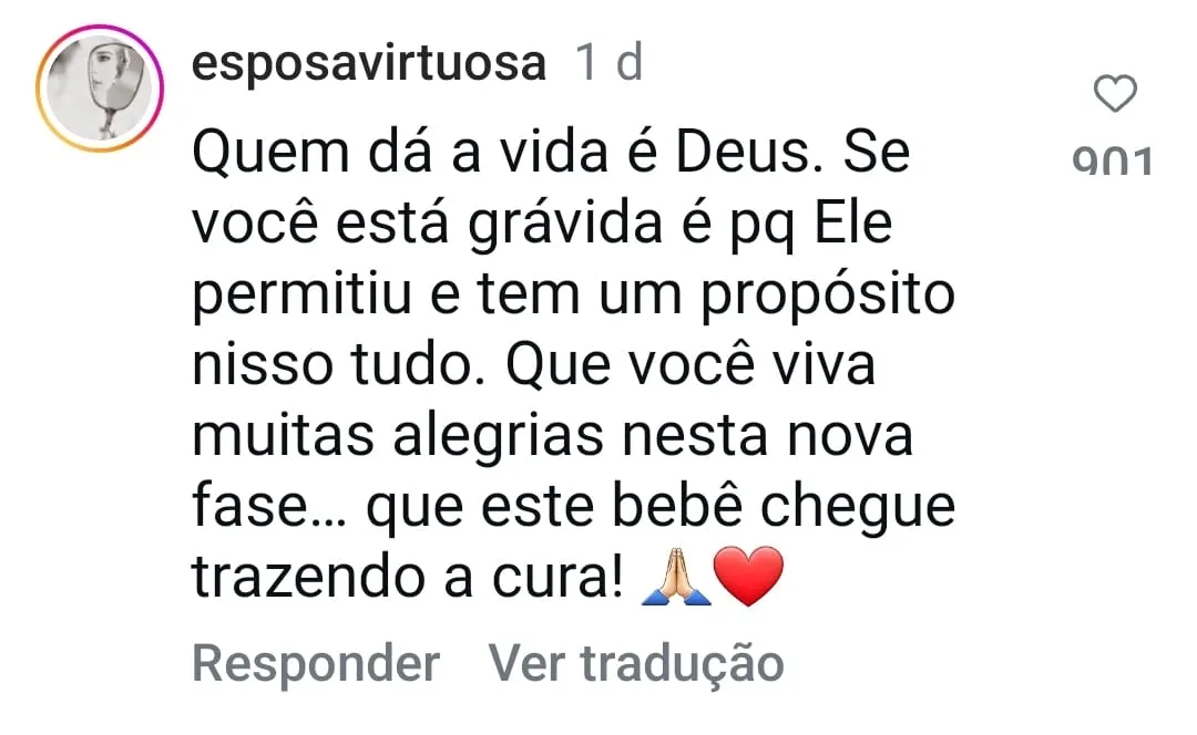 A frase está no post em que a influencer Isabel Veloso anuncia sua gravidez. Ela está com um tumor terminal perto do coração que não tem cura. De sua dor, tirou um propósito: fazer Jesus ser conhecido, como narra em seu Instagram.