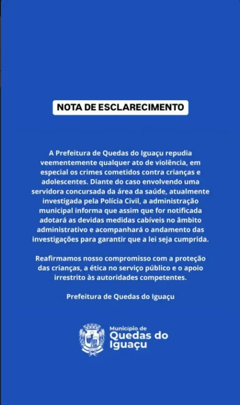 A investigada, servidora concursada da área da saúde, foi levada à Delegacia. A Prefeitura de Quedas do Iguaçu emitiu nota repudiando o caso e informou que tomará medidas administrativas após a notificação oficial.