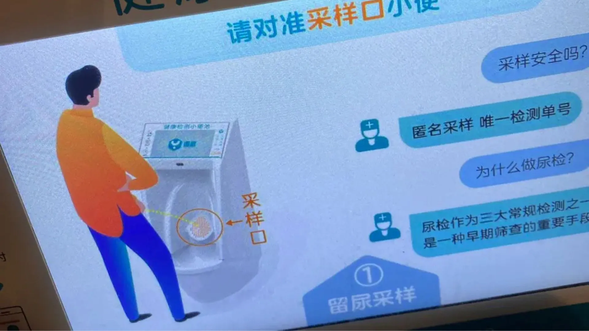 "Recentemente, mictórios Health Checking começaram a aparecer em banheiros masculinos por toda Xangai. Uma empresa privada está oferecendo a análise de urina por 20 RMB. Naturalmente, eu experimentei."