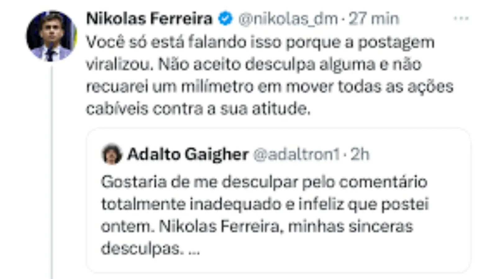 O autor da ameaça foi o estudante de Ciências Biológicas Adalto Gaigher, que comentou “Nikolas, eu vou te matar a tiros” em uma publicação sobre a morte de Charlie Kirk.