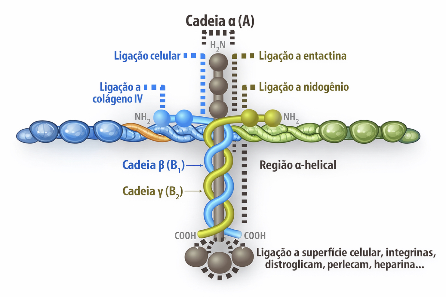 A laminina é uma molécula grande, que faz parte da base onde as células se apoiam. Se pudéssemos enxergá-la bem de perto, ela pareceria uma cruz, com três pontas menores e uma maior. Cada ponta tem a capacidade de se conectar com outras moléculas ou com as próprias células.