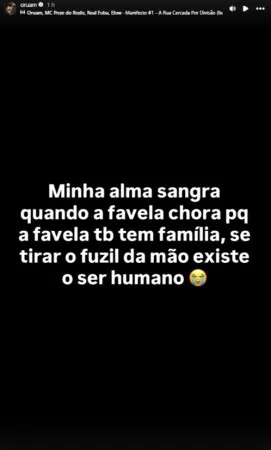 “Minha alma sangra quando a favela chora, porque a favela também tem família. Se tirar o fuzil da mão, existe o ser humano”, escreveu o rapper em um story no Instagram.