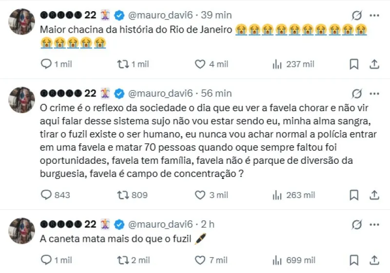 “Nunca vou achar normal a polícia entrar em uma favela e matar 70 pessoas quando o que sempre faltou foi oportunidades. A favela tem família, não é parque de diversão da burguesia. A caneta mata mais do que o fuzil.”