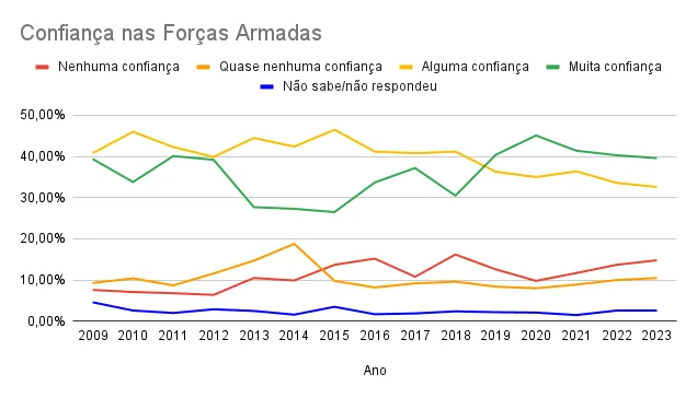 O gráfico mostra que após o impeachment de Dilma Rousseff, em 2016, as pessoas que afirmavam confiar muito nas FA aumentaram em 7,2%.