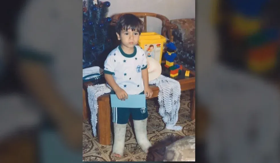 O medalhista Caio Bonfim, aos três anos, após a operação nas pernas. Imagem: acervo pessoal.