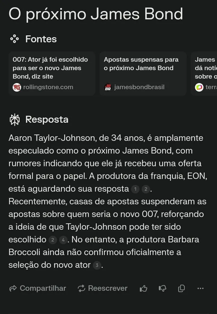 Uma resposta do Perplexity. As fontes estão logo acima e é possível ver as “bolinhas” que sinalizam o que foi usado em cada parágrafo.