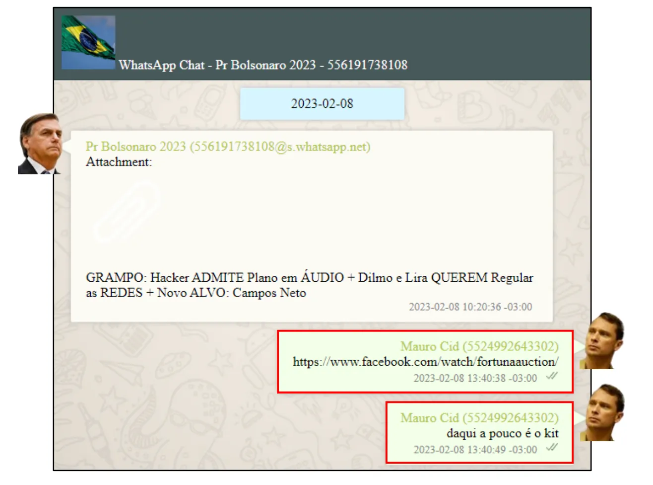 Há também a imagem de uma troca de mensagens específicas entre ele e Mauro Cid em que fica claro que o presidente sabia dos leilões.