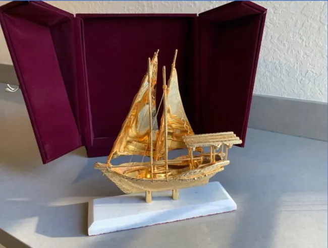 Escultura de um barco dourado. Imagem: relatório da Polícia Federal.