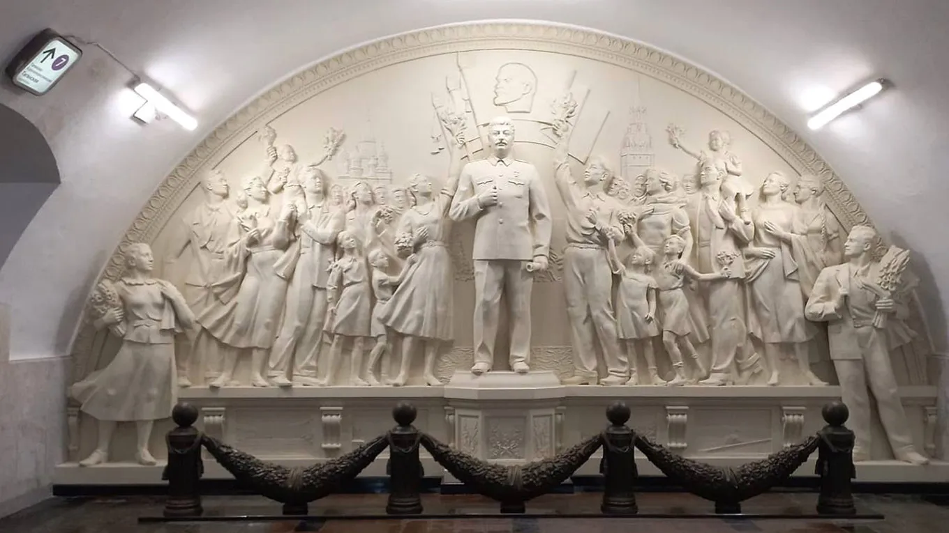 Inaugurada em maio de 2025, esse é o mais recente marco desse projeto de revisão da história do país. A obra, instalada na estação Taganskaya, uma das mais movimentadas da capital, retrata o ditador cercado por trabalhadores e crianças que lhe oferecem flores.