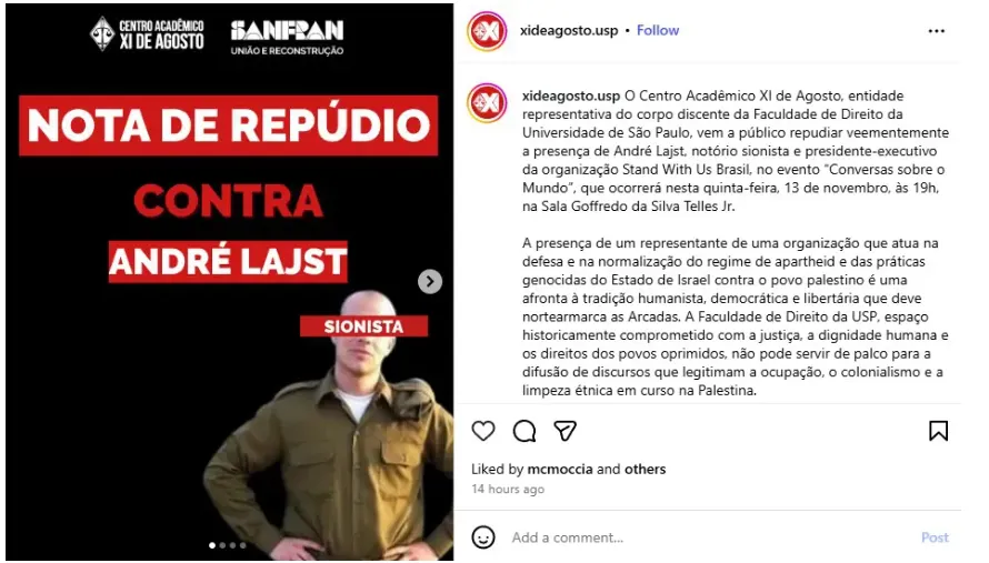 O alerta veio depois de o Centro Acadêmico XI de Agosto convocar um protesto nas redes sociais, afirmando “repúdio à presença de sionistas nas Arcadas”.